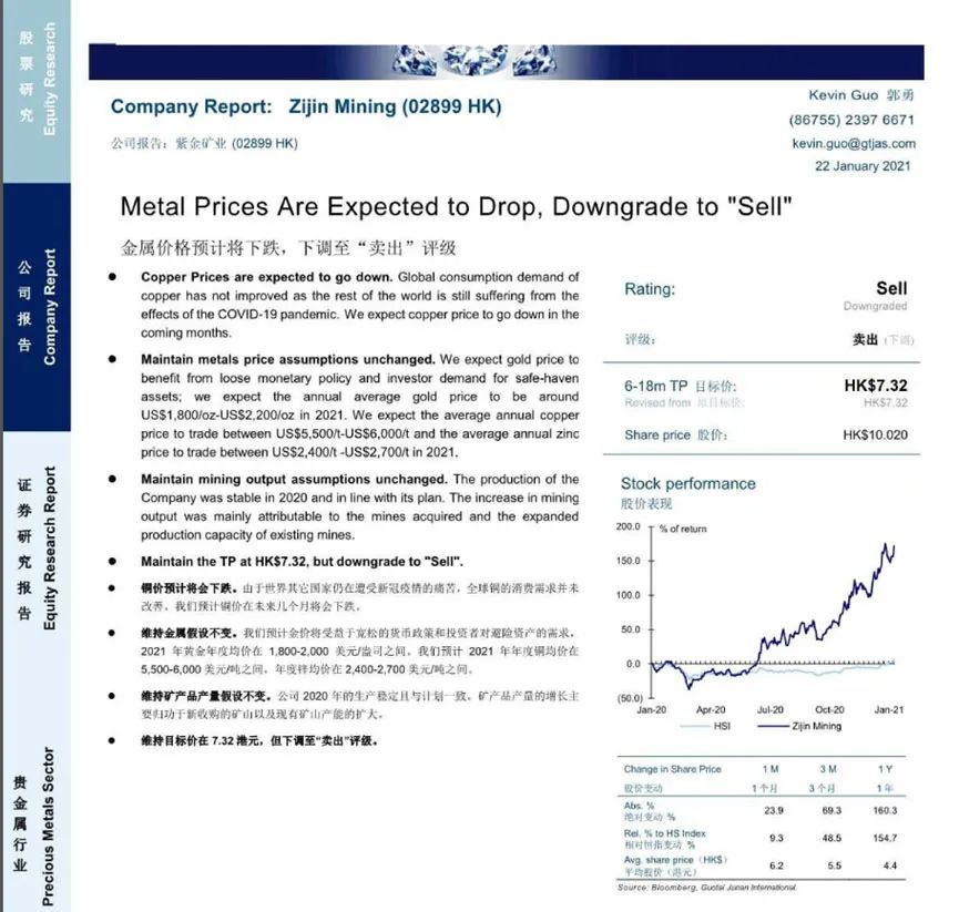 该报告发布时,紫金矿业H股收盘价为9.62港元/股,明显高于目标价。所以,国泰君安国际在报告中将紫金矿业H股下调至“卖出”评级。