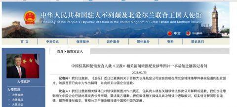 2月24日,中国驻英国使馆发言人就《卫报》相关新闻错误配发涉华图片一事答记者问时表示,有关报道错误配发带有中国国际航空公司标识的新闻图片,对中国企业形象造成负面影响,对读者造成误导,是典型的不负责任、失实报道。中国驻英使馆对此表示严重关切、强烈不满。我们要求相关媒体给出解释并立即作出更正,向“假新闻图片”的受害者道歉。中方保留作出进一步反应的权利。