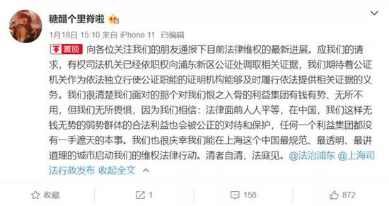 1月18日,“糖醋个里脊啦”在微博披露有权司法机关已经依职权向浦东新区公证处调取相关证据。