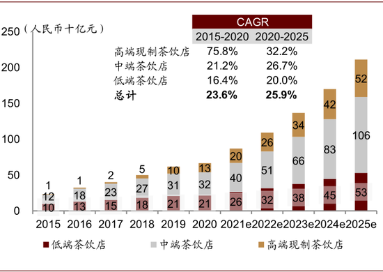 我们认为现制茶饮行业(尤其是高端现制茶饮)发展空间广阔,有望孕育大品牌。灼识咨询预计中国高端现制茶饮店现制茶饮产品销售额将由2020年的约129亿元增长至2025年的约522亿元,CAGR达32.2%。主要驱动因素为: