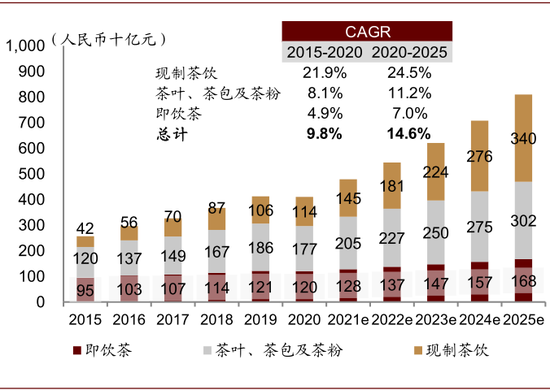 现制茶饮渗透率迅速提升。茶包括现制茶饮以及茶叶、茶包、茶粉及即饮茶饮等。长期以来,茶一直是中国文化中的传统饮品,用开水冲泡;20世纪80年代,台湾出现了珍珠奶茶,一种新的喝茶方式就此诞生,不久红遍亚洲。根据灼识咨询数据,2020年中国现制茶饮市场规模约1,136亿元,预计将以24.5%的CAGR增长至2025年的约3,400亿元,远超茶市场整体14.6%的增速,渗透率迅速提升。