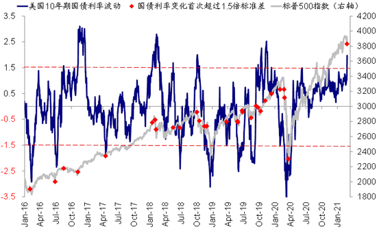 其次,对于股市而言,隔夜美债利率骤升引发的波动率走高和股市波动,从形态上非常类似2018年2月初因非农数据大超预期后10年美债快速突破2.8%后的情形,当时债券利率的波动率高达2.5倍标准差。