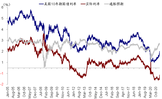 在此轮利率走高的过程中,还有一个特点是以实际利率为主,而并非市场所泛指的通胀预期,这一点与我们提示的情形一致。相比1月初的低点,10年名义美债利率已经上行超过45个基点,而实际利率贡献了近43个基点,通胀预期则基本持平。黄金近期的走势就是一个很好的佐证,因为通胀预期为主的利率上行(隐含实际利率承压或下行),黄金往往会受益。