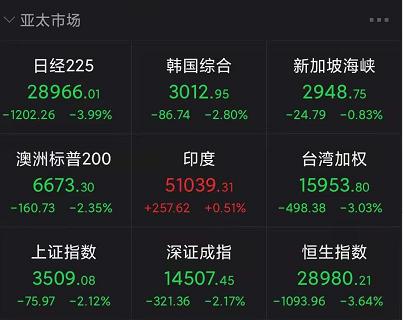热点栏目受隔夜美股拖累,今天上午,亚太市场进一步调整。日本股市大跌,收盘暴跌3.99%。韩国综合指数收盘大跌2.8%,盘中一度暴跌3.59%。港股和A股市场也进一步调整,创业板指本周跌11%,恒生指数则大幅收跌3.64%。