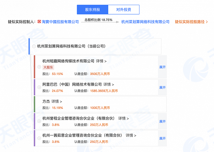 杭州菜划算网络科技有限公司成立于2018年8月,法定代表人为刘华雷,杭州短趣网络传媒技术有限公司为该公司第一大股东,持股比例为53.15%;阿里巴巴(中国)网络技术有限公司为第二大股东,持股比例为24.07%。其疑似实际控制人为淘宝中国控股有限公司。