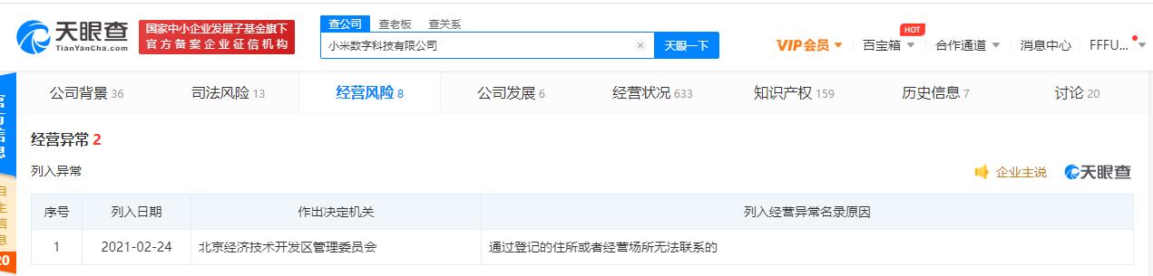 天眼查APP显示,2月24日,小米数字科技有限公司被列入经营异常。列入经营异常名录原因为通过登记的住所或者经营场所无法联系,作出决定机关为北京经济技术开发区管理委员会。