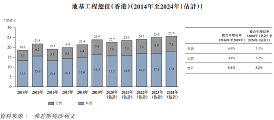 据弗若斯特沙利文报告,得益于已规划的基础设施发展项目、土地供应的增加及预计将完工的新私人住宅数量,香港地基工程的总值预期于未来5年以复合年增长率约3.2%增长,于2024年达约257亿港元。另外,鉴于私人住宅房屋供应不断增加,香港私营界别地基工程于2020年至2024年将按复合年增长率约3.1%增长。