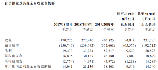 财务方面,广联工程于2017/18财年、2018/19财年、2019/20财年营收分别达1.7亿港元(单位下同)、2.73亿元和4.05亿元;同期净利润分别达1404.1万元、2515.6万元和3840.8万元。截至2019年和2020年8月31日5个月,广联工程营收分别达7491.8万元和2.21亿元;同期净利润分别达651.9万元和1434万元。