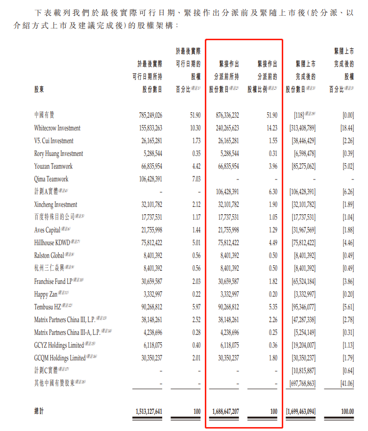 招股书显示,有赞科技在上市前的股东架构中,控股股东为中国有赞(08083.HK),持有51.90%的股份。
