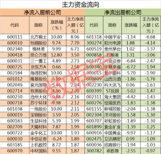 主力资金净流出居前的公司有中国平安、阳光电源、贵州茅台、五粮液、兴业证券等,其中兴业证券、华夏幸福和爱尔眼科跌幅均超5%。