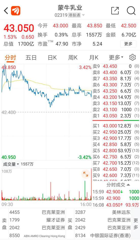 从股价表现来看,市场对达能减持的消息似乎并不悲观。3月1日开盘后,蒙牛股价持续走高,一度涨逾3.4%,最终收盘上涨1.53%,报43.05港元。