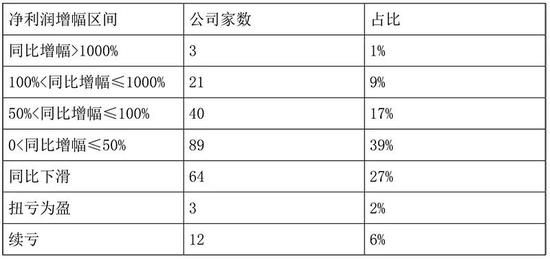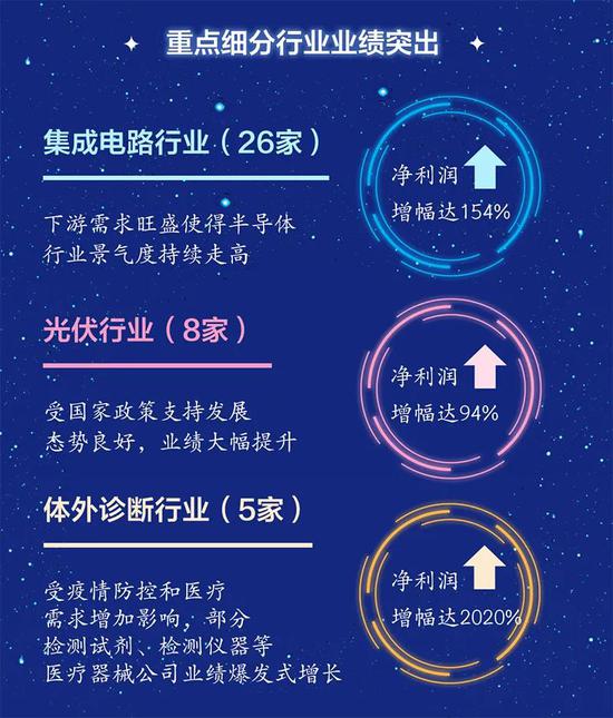 具体来看,集成电路行业,下游需求旺盛使得半导体行业景气度持续走高,合计26家,净利润增幅达154%;光伏行业受国家政策支持发展态势良好,业绩大幅提升,合计8家净利润增幅达94%;体外诊断行业受疫情防控和医疗需求增加影响,部分检测试剂、检测仪器等医疗器械公司业绩爆发式增长,合计5家净利润增幅达2020%。