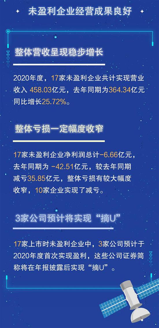值得一提的是,17家上市时未盈利企业中,中芯国际、仕佳光子、九号公司3家公司预计于2020年度首次实现盈利,这些公司证券简称将在年报披露后实现“摘U”。