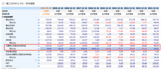 翻阅三一重工近10年来的财报数据,记者发现,三一重工在2012年至2015年期间,业绩出现明显下滑趋势,其中,2015年实现营收233.67亿元,相对于2011年的507.76亿元已经减半,当时公司净利润为1.39亿元,达到近十年的最低点。