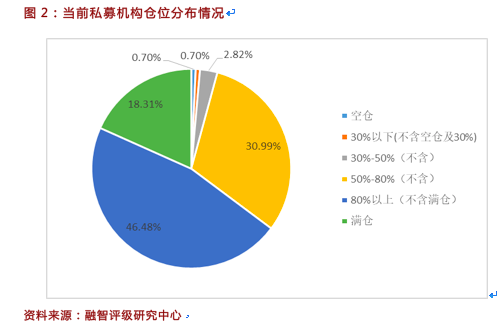 具体仓位分布显示,仓位比在五成及五成以上的私募基金占比95.77%;仓位比80%以上区间的私募占比46.48%,相比上月的48.32%下降1.84个百分点;仓位比50%至80%区间的私募占比30.99%,相较上月30.20%上升0.79个百分点。显然,仓位在八成以上的私募数量有所减少,可以看出基金经理对后市行情偏谨慎。