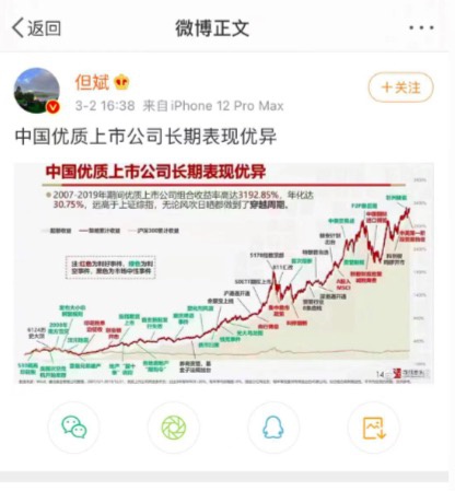 3月2日盘后,但斌的实名微博转发网友“肯定没有减持(贵州茅台)啊”的评论,并点赞。