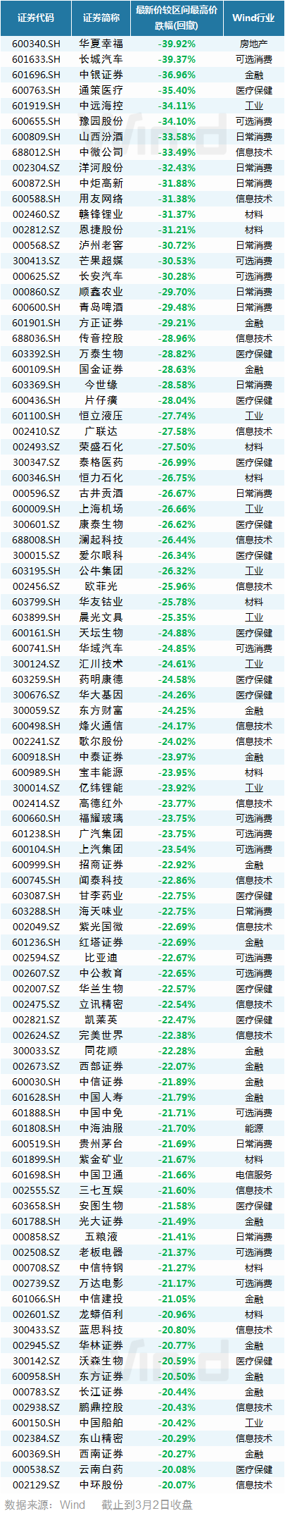 Wind数据显示,沪深300指数成分中,最新收盘价自今年最高点回撤幅度超过20%的公司增至94家,占比超过三成。