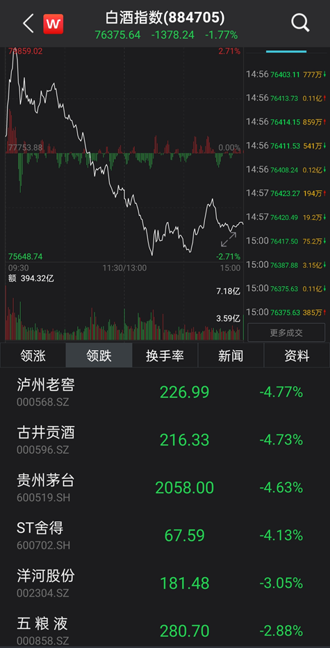 白酒板块指数整体下跌1.77%,泸州老窖、古井贡酒多只个股跌逾4%。