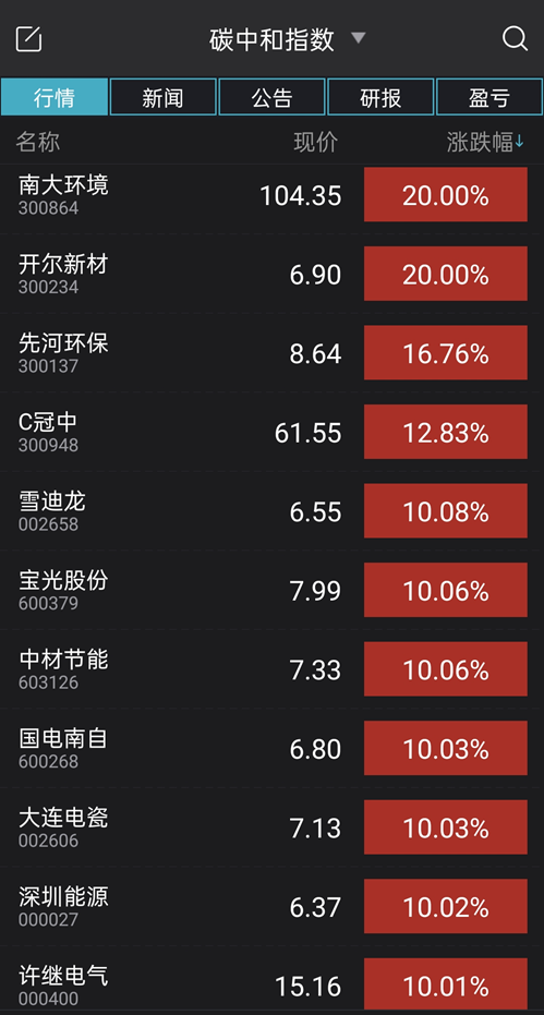碳中和成为市场唯一热点,多只个股逆势涨停,涉及了碳交易、环保、智能电网、水电等多个细分领域。
