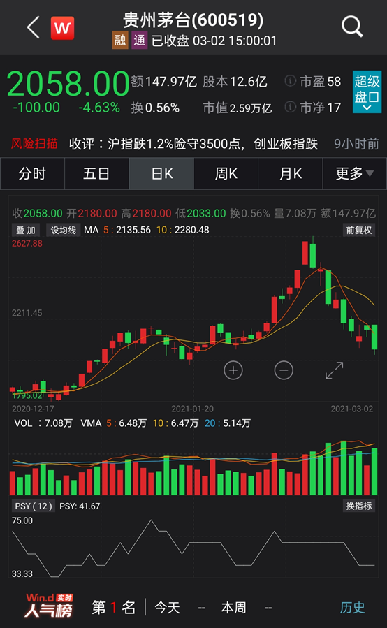 周二,贵州茅台收跌4.63%,股价报2058元,牛年累计下挫20.88%,进入技术性熊市。