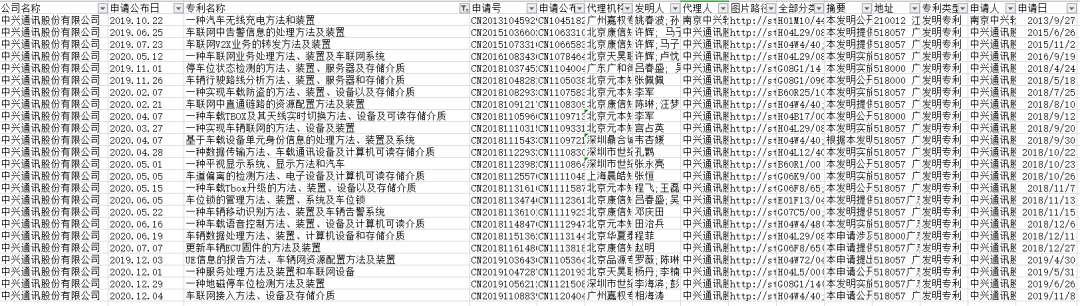 天眼查专业版显示,在中兴通讯5001件专利中,有24条与汽车相关专利,其中最早一条申请日出现在2013年9月,最晚一条出现在2019年11月8日。