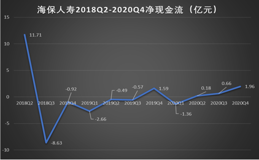 此外,海保人寿在现金流方面也略有压力。2018年第二季度-2020年第四季度的净现金流分别为11.71亿元、-8.63亿元、-0.92亿元、-2.66亿元、-0.49亿元、-0.57亿元、1.59亿元、-1.36亿元、0.18亿元、0.66亿元和1.96亿元。
