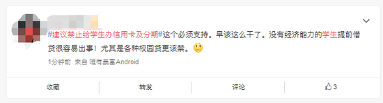 还有网友指出,早就应该禁止学生办理信用卡。“没有经济能力的学生提前借贷很容易出事!尤其是各种校园贷更该禁。”