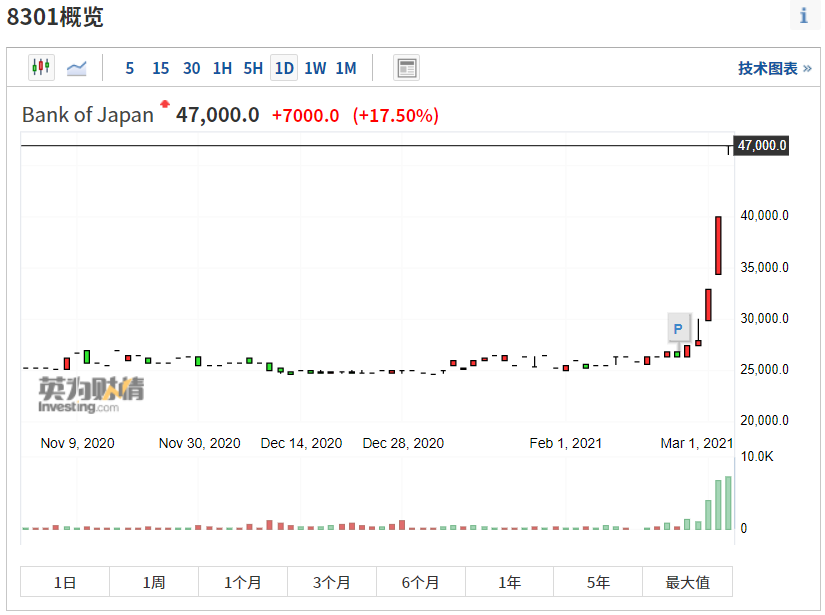 3月3日,日本央行在东京交易所上市的股票价格突然暴涨17.5%,迅速触及涨幅限制而停止交易,股价飙升至47000日元,刷新了自2015年以来的新高。