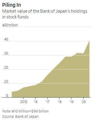 另外,据日本央行发布2020年半年度财务报告显示,股票投资组合在这六个月中取得创纪录的收益。日本央行称,截至2020年9月30日,其持有的股票市值相当于近4000亿美元,这意味着未兑现利润达到560亿美元。