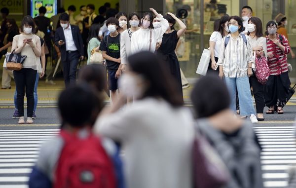7月10日,在日本东京新宿,人们佩戴口罩出行。(新华社)