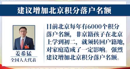 全国人大代表姜希猛建议,增加北京积分落户名额。姜希猛表示,目前北京每年只有6000个积分落户名额,由于北京市非京户籍人口多年积累的存量较大,每年6000个落户名额难以解决当前存量问题。大部分非京籍家庭的孩子在北京上学到初二,就须转回户籍地参加中考。在生活和经济方面,对相关家庭造成了一定影响。姜希猛建议增加北京积分落户的名额。