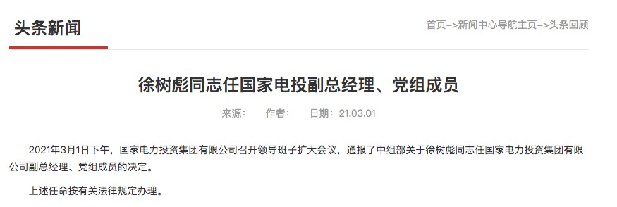 国家电投前几日新上任一位副总经理。国家电力投资集团有限公司网站3月1日消息,当日下午,国家电力投资集团有限公司召开领导班子扩大会议,通报了中组部关于徐树彪同志任国家电力投资集团有限公司副总经理、党组成员的决定。