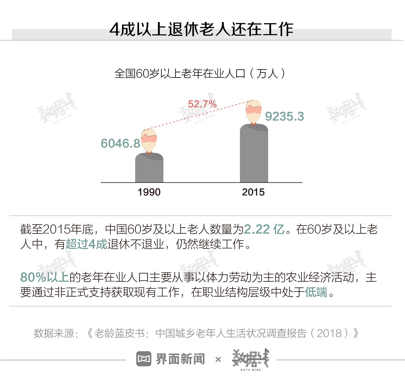 其实,中国还是有4成以上的老年人退休后继续工作,但多以农业劳动为主。据《老龄蓝皮书:中国城乡老年人生活状况调查报告(2018)》,2015年中国60岁及以上老年人口中,超4成还在工作,其中 80%以上的老年人工作以体力劳动为主,而且农业劳动居多。