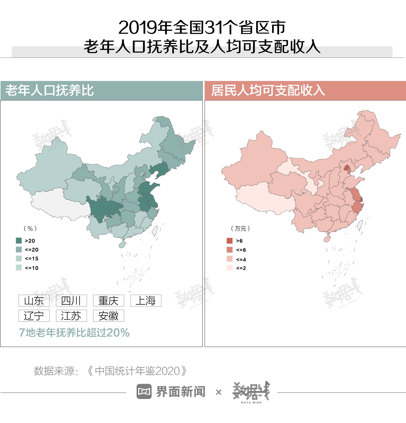 从各地来看,形势更为严峻,部分地区出现“未富先老”现象。据国家统计局,2019年老年抚养比较高的省区市中,既有人均收入高的,也有挣得少的。其中,上海、江苏、辽宁和山东4地人均收入在3万元以上,重庆、安徽和四川3地人均收入不足3万元。
