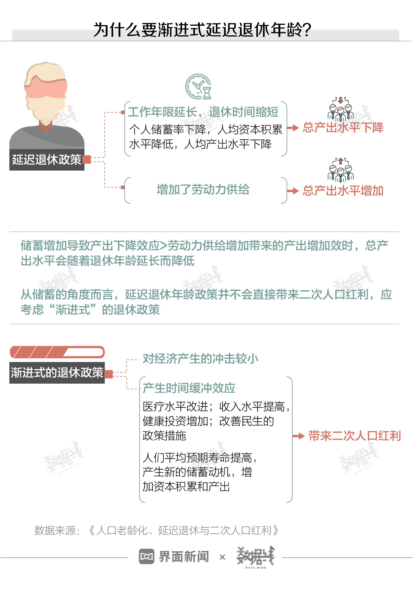 什么是渐进式延迟退休年龄?即在执行延迟退休政策后,每过一年或几年调整一次,每次延后退休年龄几个月,逐渐延迟到预期的退休年龄。这样在减少经济冲击的同时,可以产生时间缓冲效应。随着预期寿命的提高,人们也会重新考虑存钱养老,增加资本积累,带来二次人口红利。