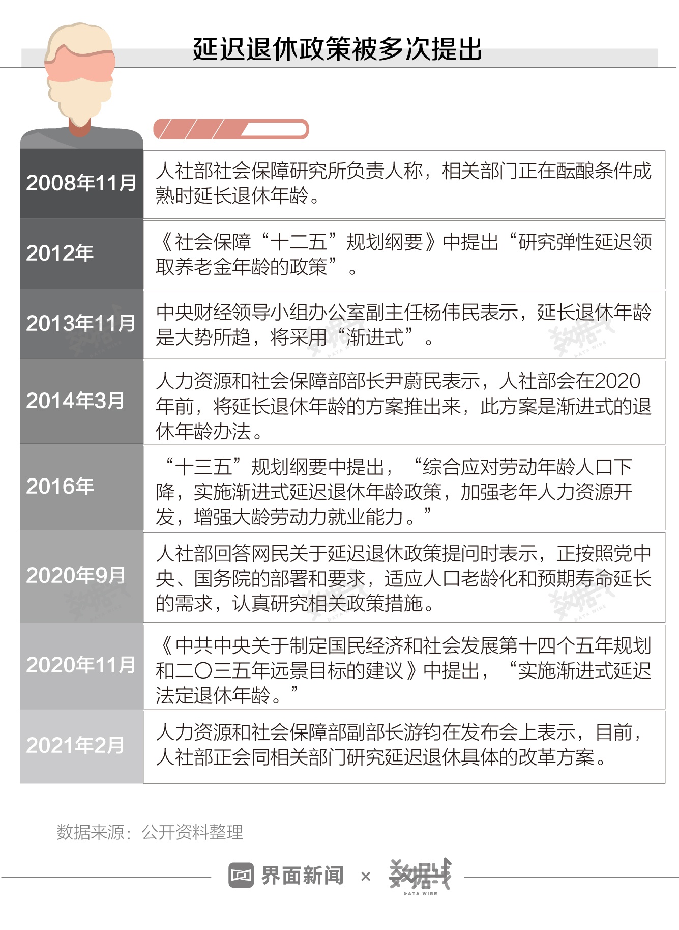 据界面数据不完全统计,有关部门先后8次提出“延迟退休”政策,相关提法更是从“研究制定”进入“计划实施”阶段。提高法定退休年龄已经是“箭在弦上”。