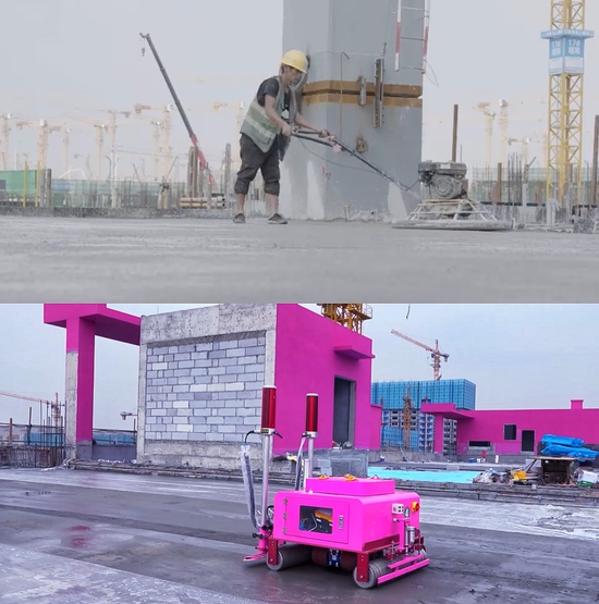 “正在作业,请注意……正在作业,请注意”,在佛山顺德凤桐花园项目,粉红色喷漆机器人、铺砖机器人这样一群特殊的“建筑工”,穿梭在百来平米的房间内来回作业,与灰白的墙面对比形成一道风景线。