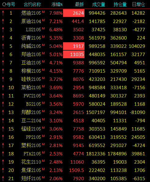 热点栏目3月8日,国内期市多数收涨,能化品涨幅居前,燃油、纯碱涨停,原油涨逾7%,沥青涨逾5%;油脂油料多数上涨,菜油涨停,豆油涨近5%,棕榈油涨逾4%;铁合金齐涨,硅铁、锰硅涨逾3%;股指大跌,IF跌逾4%,IH跌近4%。
