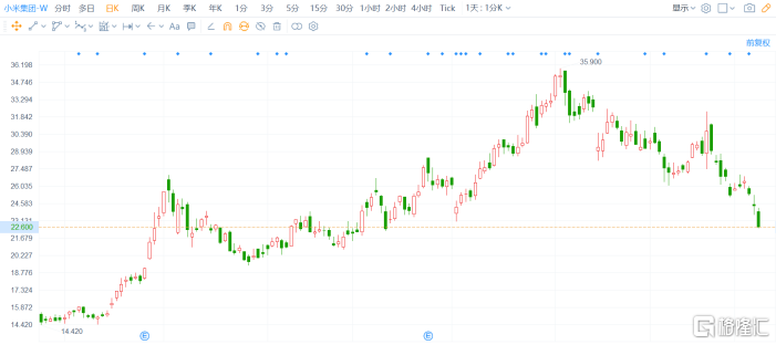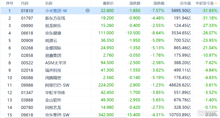 板块内所有成分股悉数下跌,大市值科技股中,京东健康跌超7%,美团、小米集团跌超6%。近20日以来,32只成分股中,仅3只股票微涨,美团、京东健康、比亚迪跌超20%,小米、阿里、腾讯跌超10%,其余全部跟跌。年初至今,更是近一半公司已跌至年初股价。