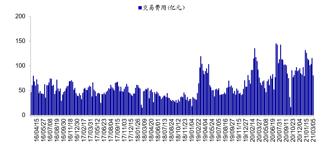 最近一周交易费用(包括交易佣金和印花税)为80亿元,前一周为115亿元。