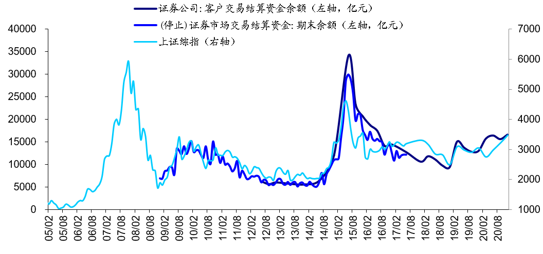 投保基金公司的银证转账数据只公布到2017年6月,之后的数据用证券业协会的证券公司客户交易结算资金来统计,20Q4余额为16600亿元,较20Q3上升1000亿元。