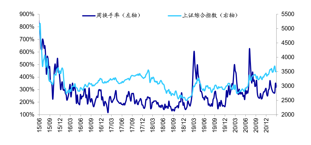 2005年以来周换手率(年化)高点、低点分别为1719%、87%、均值为354%,最新一周为318%,处在历史上由低到高63%的分位,较前一周的350%下降。