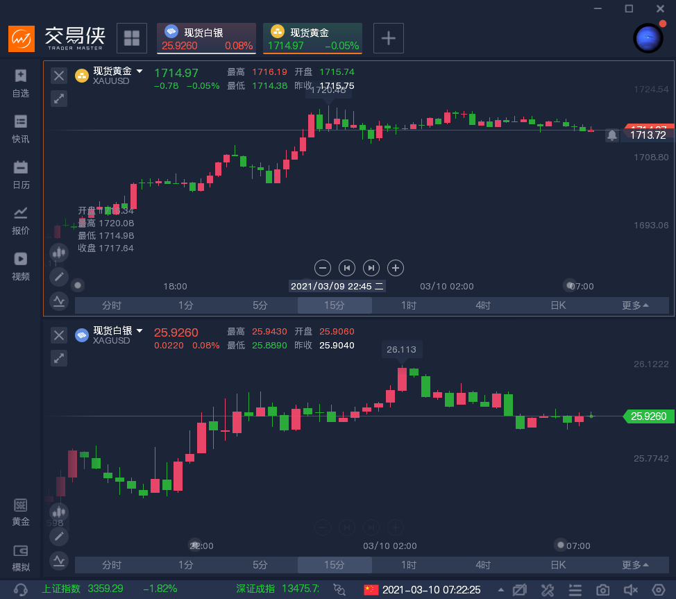 金市方面,现货黄金盘初涨破1720美元关口,较日低回升40美元,随后维持在近期高位震荡;现货白银日内大涨4%,一度站上26美元。
