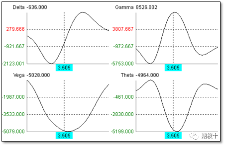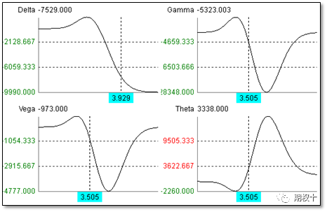 而从波动率策略来看,目前各品种期权波动率处于相对高位,但若市场恐慌情绪进一步加剧,隐含波动率仍具有较大上涨空间,以2020年3月中下旬及2020年7月初市场为例,彼时隐含波动率可升至50%+。因此,以目前波动率水平而言,波动率卖方应控制好仓位,做好波动率进一步上升而应对的子弹。此外,若波动率进一步回落至25%以下,在期权临近到期前可考虑小仓位布局看多波动率组合。就目前而言,随着3月期权合约到期日逐日近邻,做空波动率策略往往面临Gamma值逐渐增大的问题,在标的日内波动较大的情况下对冲成本较大。因此,可考虑买入3月宽跨式组合,并卖出4月同行权价的宽跨式组合,在保持负Vega的敞口下,尽可能对冲Gamma风险。以50ETF期权为例,可考虑买入3月Call@3700及Put@3400,并卖出4月Call@3700及Put@3400,其风险值如下:
