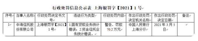 中国人民银行上海分行对中海信托股份有限公司下发行政处罚决定书(上海银罚字【2021】1号),对中海信托警告,罚款70.2万元。