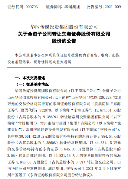 3月9日晚间,上市公司华闻集团(000793.SZ)发布公告称,旗下全资子公司山南华闻创业投资有限公司(简称:山南华闻)拟作价12.02亿元转让其所持的东海证券1.57亿股。