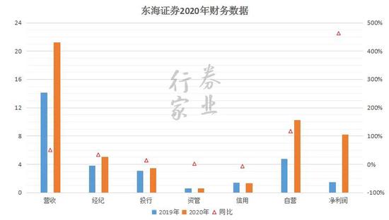 1月中旬,东海证券已经先期披露了2020年度未经审计财务报表(母公司口径):当期实现营业收入21.21亿元,同比增长50.06%;净利润8.18亿元,同比飙升462.10%。——在已经发布业绩数据的券商中,东海证券净利润增速位列首位。