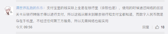 热心网友也是纷纷进行科普。网友@满世界乱跑的东东 评论称,支付宝里的钱实际上全是在银行里(余额也是),使用的时候通过网络的层层关卡从银行转账才得以进行支付,所以这钱从哪来到哪去银行和支付宝都知道,而数字人民币就是存在手机里,不经过任何第三方服务,所以无需网络也能实用。