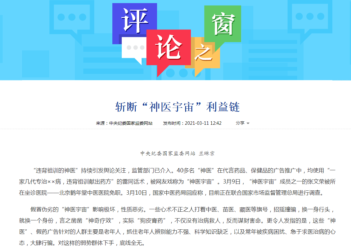 3月11日,中央纪委国家监委网站发布对“违背祖训的神医”事件的评论。评论中提到,近期,部分“神医”从电视台的养生类节目中消失,但又开始流窜到短视频平台、社交媒体平台,继续行骗。这也提醒相关部门,打击、监管工作要因时而变,及时跟上,让“换了马甲”的违禁广告和骗局无处遁形。