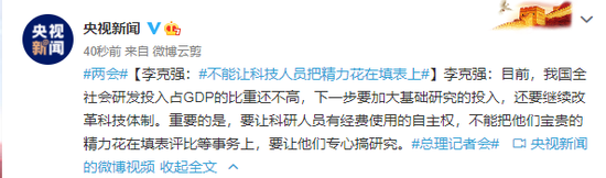 李克强:目前,我国全社会研发投入占GDP的比重还不高,下一步要加大基础研究的投入,还要继续改革科技体制。重要的是,要让科研人员有经费使用的自主权,不能把他们宝贵的精力花在填表评比等事务上,要让他们专心搞研究。